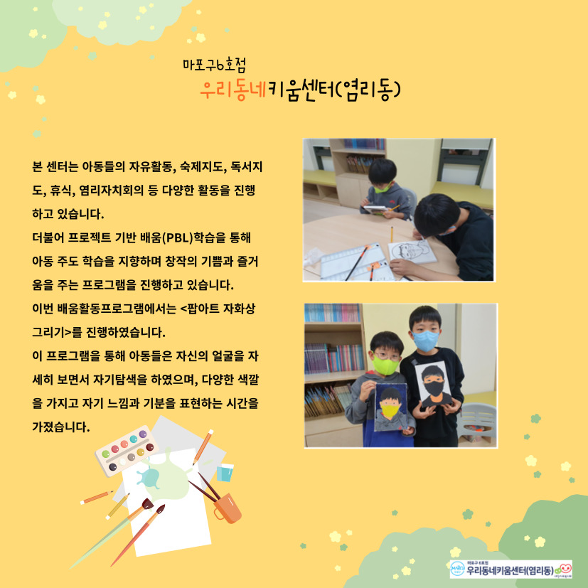 마포구6호점 우리동네키움센터(염리동)은 대한사회복지회에서 운영하는 서울시 마포구에 위치한 아동돌봄시설입니다..