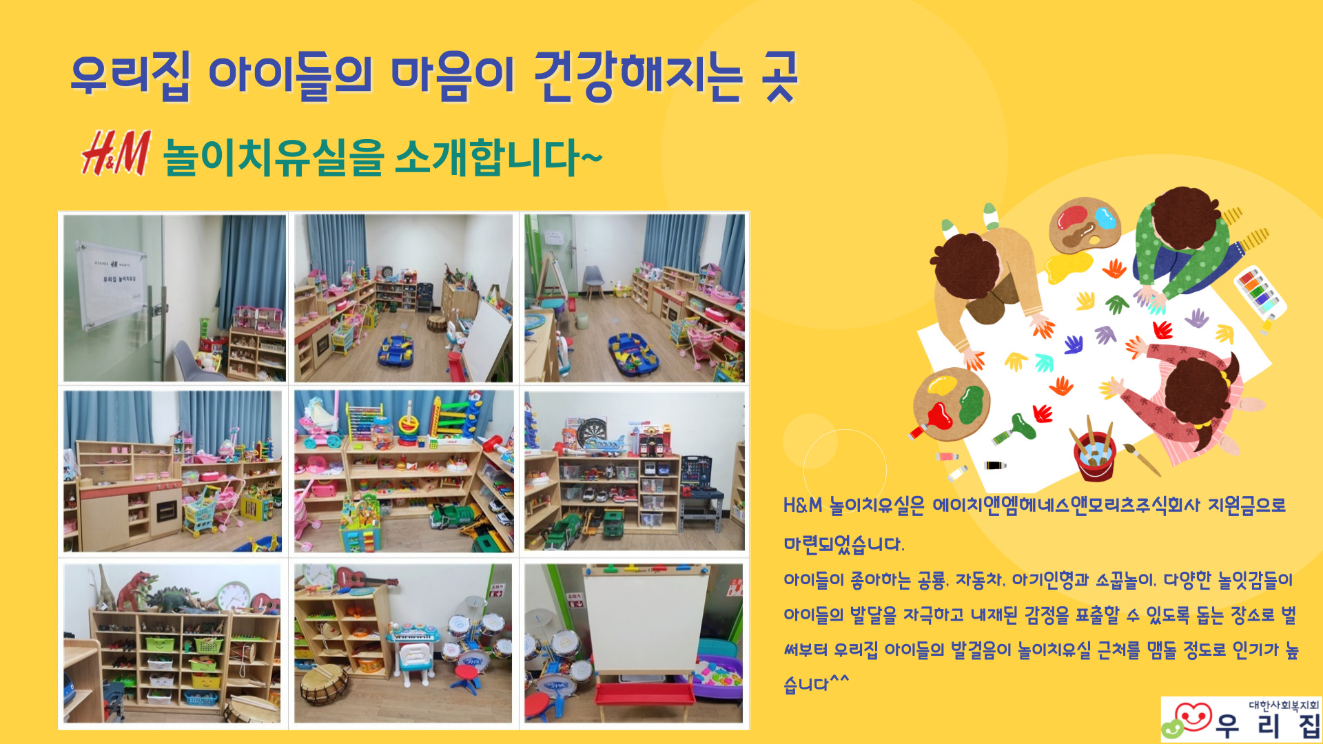 우리집은 아이들을 위한 놀이치유실을 오픈하였습니다. 이번 공간조성은 에이치앤엠헤네스앤모리츠 주식회사 지원금..