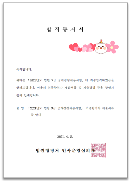 우리집에서 생활 중인 민수엄마(가명)는 2021년도 법원 9급 공개경쟁채용시험에 최종 합격을 하였습니다..