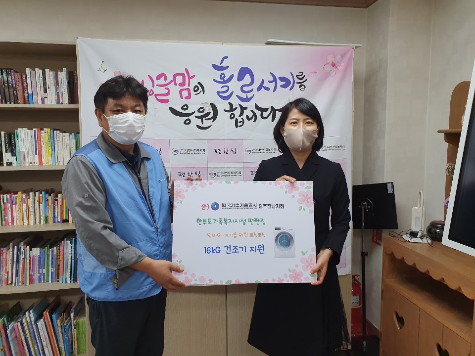 한국가스공사 광주전남지회에서 편한집 가족들의 쾌적하고 편리한 생활을 위해 건조기 1대를 기증해 주셨습니다.편한집은 대한사회복지회에서 운영하는 광주에 위치한 미..