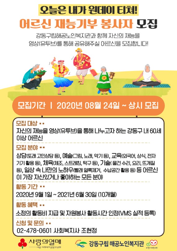 Copyright © Korea Welfare Services All right reserved강동구립 해공노인복지관은 2020년 9월부터 지역사회(강동구) 내 어르신의 사회활동 참여를 위한 온라인 재..