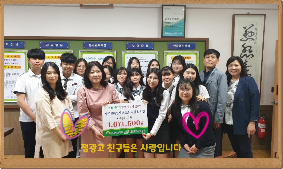 이웃사랑을 실천하는 정광고 친구들이 올해도 열심히 해피빈 사이버 기금을 모아 전달해 주었는데요. 이번에는 사이버 기금뿐 아니라 저금통 모금활동도 함..
