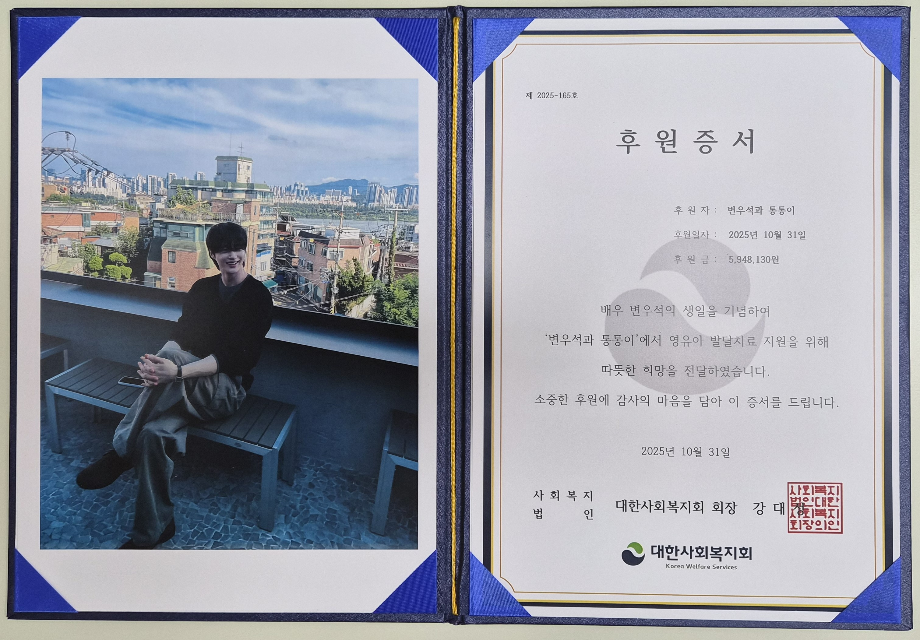 ▲ 대한사회복지회(회장 강대성)가 배우 변우석의 팬덤 ‘변우석과 통통이’에게 전달한 후원증서
