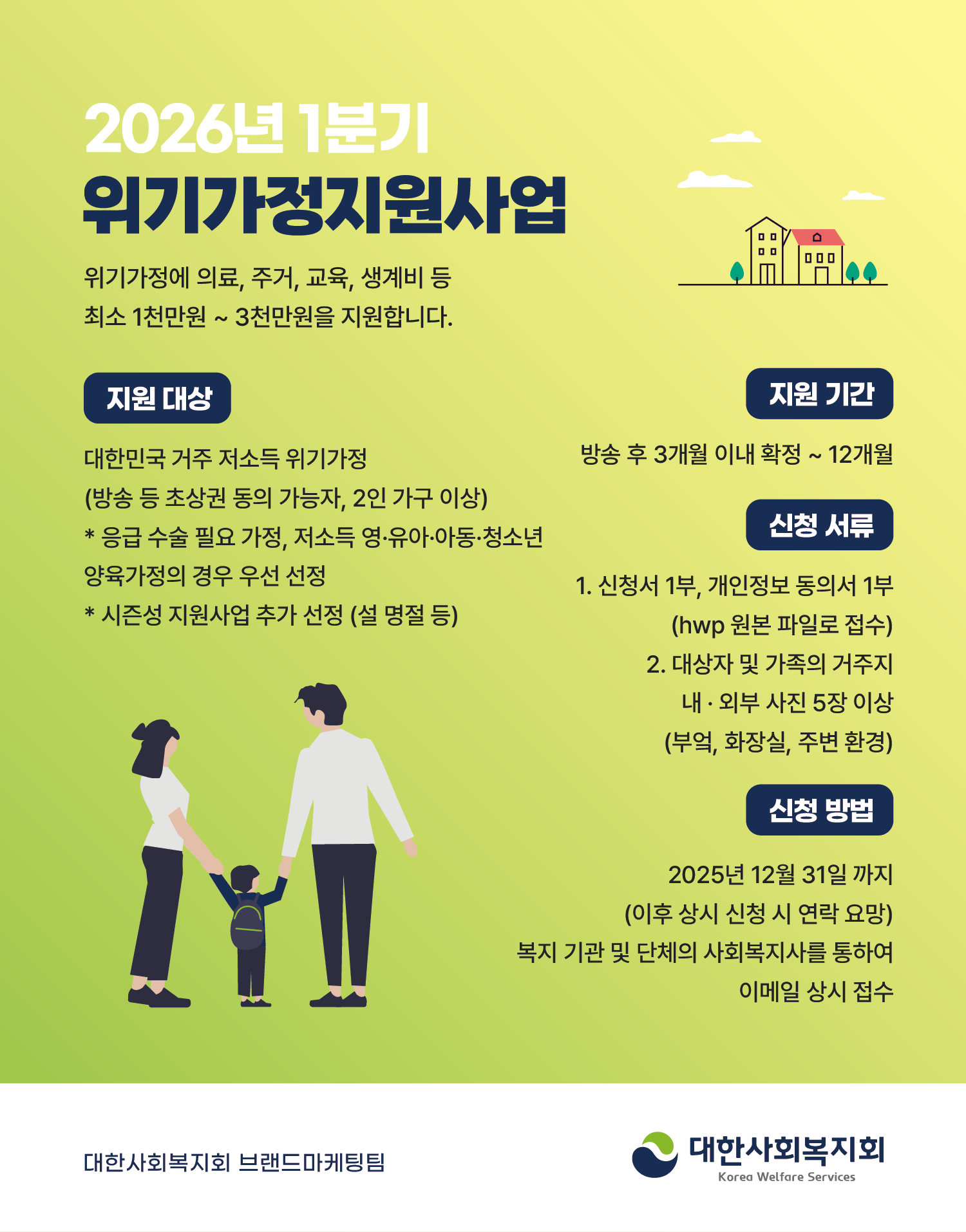 사회복지법인 대한사회복지회(회장 강대성)는 국내 위기가정을 돕기 위해 EBS ‘나눔 0700’ 2026년 1분기 신청자를 오는 12월 31일까지 모집한다고 밝혔다.