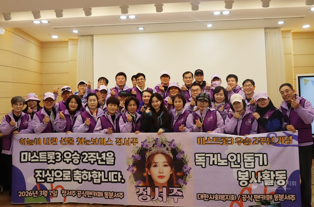 가수 정서주 님과 공식 팬카페 ‘동분서주’의 회원 30여명이 ‘미스트롯3’ 우승 2주년을 기념해 본회 운영시설인 강동구립해공노인복지관을 찾아 어르신을 위한 500만 원을 기부하고 봉사활동을 진행하였습니다.
